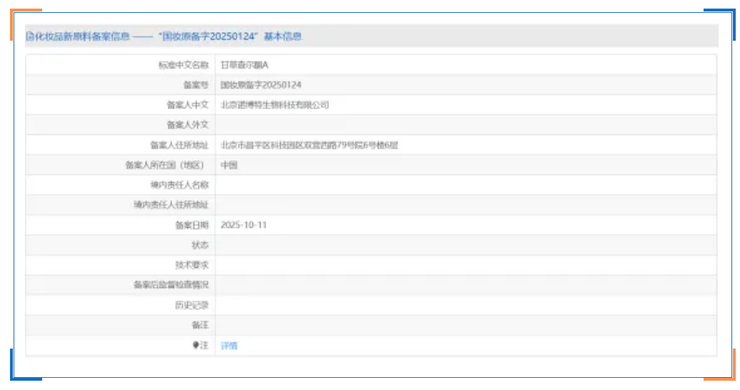 2025年10月11日,爱美客携手泛植制药成功完成首个化妆品新原料”甘草查尔酮A “的备案,备案号为:国妆原备字"20250124"。标志着爱美客正式布局功能性植物护肤原料领域,与泛植制药共同开启了中国本土植物成分在化妆品行业的创新应用新篇。